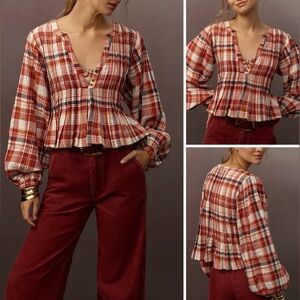 NWT Anthropologie Pilcro Long-Sleeve Pleated Swing Blouse - red motif - M, XL