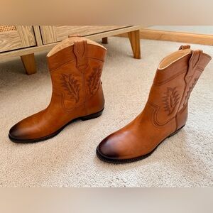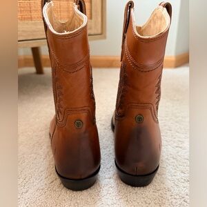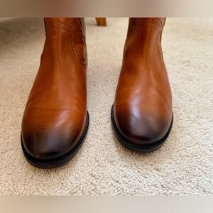 Elegant Frye boots with detailed stitching. Smooth cinnamon leather and sturdy heel.
