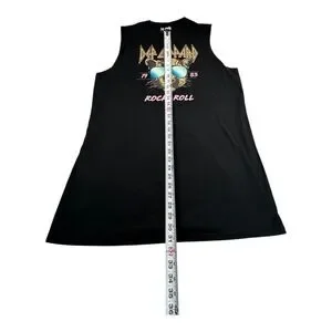 Black Def Leppard sleeveless tee dress featuring a leopard head graphic with sunglasses, the band's logo above, and "Rock & Roll" text below. The garment captures a nostalgic aesthetic with its 1979-1983 reference. The item offers a relaxed fit, making it suitable for casual wear and a statement piece for fans of the band. This t-shirt dress presents itself as a fusion of music memorabilia and everyday apparel.