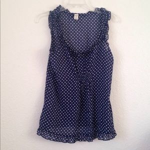 This is a Ladies' Old Navy Polka Dot Tank Top that is gathered centered under the bust area, Size: S. The neckline, sleeves, and bottom hem are all ruffled.