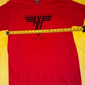 Vibrant red tee featuring bold black design. Perfect for casual outings.
