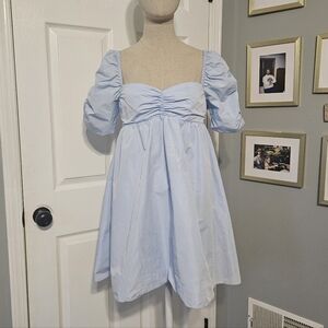 Chic mini babydoll cut dress with puff sleeves. Sweetheart neckline. Perfect for any occasion. Has pockets.
