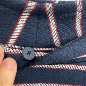 Elevate your wardrobe with the unparalleled sophistication of the Banana Republic Navy Stripe Bow Neck Zip Front Jacket Blazer. This sartorial masterpiece combines classic design with contemporary flair, enveloping you in a rich palette of red, white, and blue stripes that are both timeless and chic. The precision of the zip-front closure offers a sleek silhouette, while the convenient pockets are perfectly placed for effortless style and utility. Additionally, the piece de resistance—a removable bow tie—provides the versatility to tailor your look from understated elegance to a statement of refined confidence. Whether you're commanding the boardroom or enjoying a casual outing, this blazer seamlessly adapts, ensuring you exude poise and charm with every wear. Make a statement of style and authority, and let your wardrobe speak volumes with this exquisite blazer.