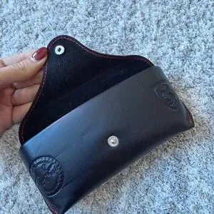 Stylish black sunglasses case with red stitching and button. Embossed logos add a unique touch.