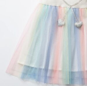 This charming kids dress features a delightful pastel rainbow skirt and a cute heart design on the bodice. Perfect for any special occasion.