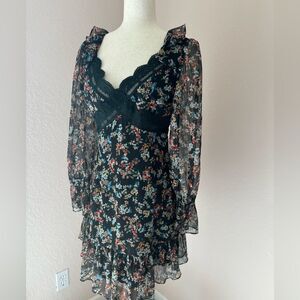 Beautiful chiffon dress with lace insert on the bust, floral chiffon pattern, sheer sleeves , ruffle details