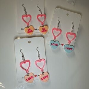 Cute candy heart-shaped earrings with 'Love' or 'Be Mine' text. Perfect for adding a playful touch to any outfit.