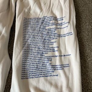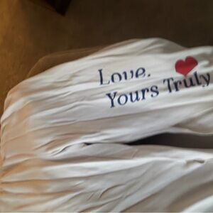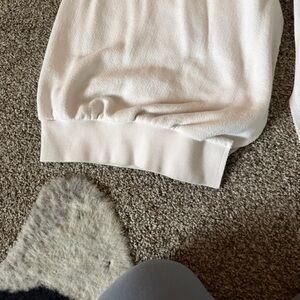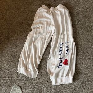 Boys Lie Yours Truly Marshall sweatpants with a split hem in cream, size medium. Some signs of wear including graphics cracked, slight pilling, discoloration, minor staining on bottoms. These are very comfortable and easy to wear. Need steamed with wrinkling.