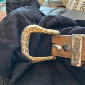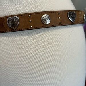 Chic Ariat belt in rich brown. Features silver heart and buckle accents. Perfect for a stylish touch.