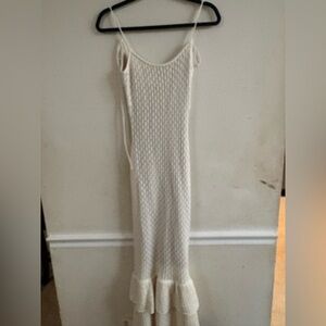 Stylish cream crochet dress with ruffle hem. Perfect for summer occasions.