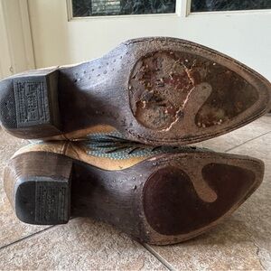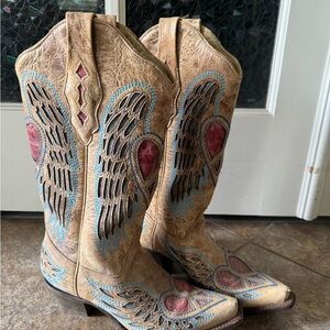Step out in style with these unique women's western boots featuring intricate heart embroidery. The boots showcase a blend of tan and pink hues, perfect for adding a touch of flair to any outfit. bottom is cracking, see photos, may need fixing.