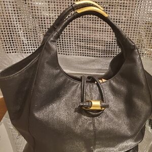 Beautiful black metallic bag by Antonio Melani. This stunning bag features strap closure,2 pouches and zippered pocket. Lining is a beautiful gold.