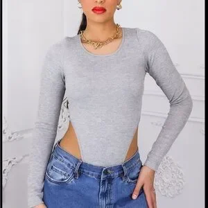 This gray long sleeve bodysuit features a stylish cut out design that adds a modern twist. The form-fitting silhouette and soft stretchy fabric ensure a comfortable yet flattering fit. Perfect for pairing with high-waisted bottoms, this top is a versatile addition to any wardrobe.