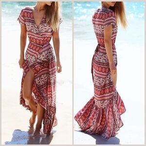 LE SALTY LABEL Bohemian Red Maxi Wrap Beach Cover Vacation Dress, Cover Up, L