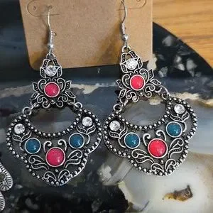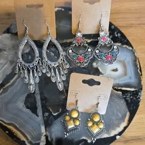 Set of bohemian earrings in silver and yellow. Includes intricate designs with colorful accents. These are paparazzi earrings so no lead or nickel! I cleaned the posts with alcohol. only wore a few times so in good condition.