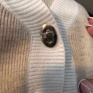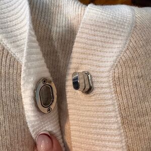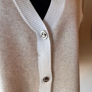 Elegant beige and white collared, sleeveless, cropped knit top. Features 3 toggled silver toned button front closure. Soft material blend of polyester and viscose. Ideal for versatile styling.