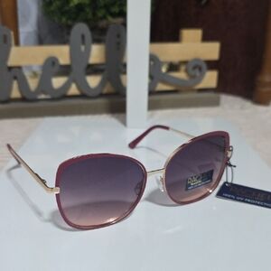 Elevate your accessory game with these stunning Rachel Roy sunglasses. Designed with a modern, oversized square silhouette, these frames feature a sophisticated rich burgundy/plum rim beautifully accented by polished gold-tone hardware. These shades offer a chic, designer aesthetic that transitions effortlessly from beach days to city strolls.