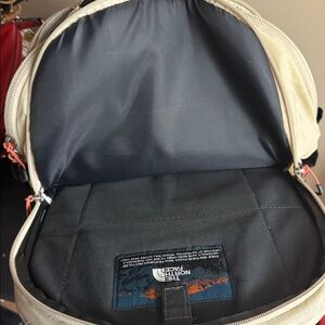 The North Face Borealis backpack in tan/khaki and black with orange bungee cord front system. Features FlexVent padded back panel, adjustable shoulder straps, sternum strap, and waist straps.