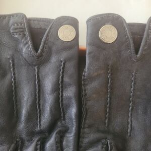 Elegant black leather gloves by Hermes. Features silver button detail. Luxurious and stylish.
