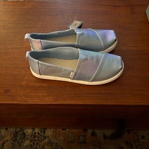 Brand new in box, never worn. TOMS Youth Alpargata slip-ons in a shiny multi iridescent canvas finish. Easy slip-on style with elastic V inset and classic TOMS comfort. Youth size 5 (fits approx. women’s 6.5). Comes with original box and tags.