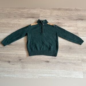 Janie and Jack "Auto Club" shoulder patch sweater from their Fall 2014 collection. It is a forest green, 100% combed cotton, quarter-zip sweater featuring faux suede shoulder and elbow patches.