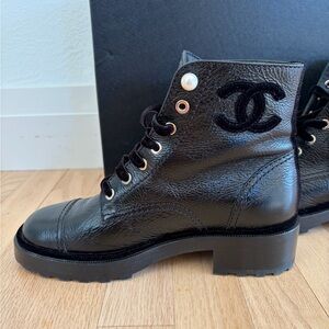 These iconic Chanel short boots offer a perfect blend of sophistication and comfort. Crafted from high-quality leather, they feature the signature Chanel logo on the heel for a touch of luxury. The boots are in excellent gently worn condition with minimal signs of use, making them a perfect addition to your wardrobe. With a sleek silhouette and versatile design, they pair effortlessly with both casual and dressy outfits. Whether you're heading to work or a night out, these boots add an elegant edge to any look.