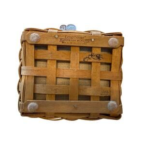Longaberger Father's Day Pocket Change Basket in warm brown stain. Ensemble including woodcraft lid, protector, butternut plaid liner, tie on, product card. 5.24 x 4.75 x 3” Condition is "Used" excellent with no damage.