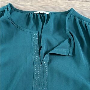 Chic teal blouse. Rolled sleeves with button detail. Perfect for any occasion.
