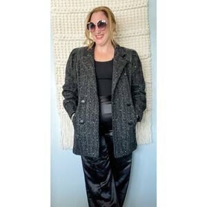 Fun vintage 80s marled wool double breasted pea coat with fabulous puffed shoulders and leather detail! Side pockets. Fully lined. Hang chain. Great street style! Made in the USA back in its day