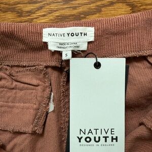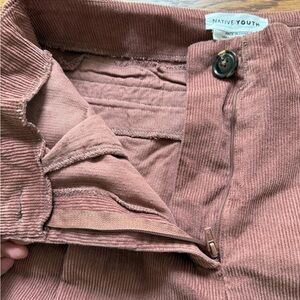 This is a pair of baggy oversized wide leg pleated corduroy pants by Native youth sold at Anthropologie. New with tags. Zip and button closure. Three pockets. Color was hard to capture. The closest images are the ones that are up close featuring the brand label. Cotton and viscose. Machine wash.