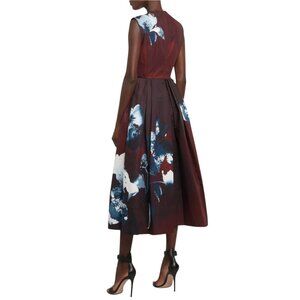'The abstract floral detailing complements the fitted waist and full, midi-length skirt on this whimsical design.