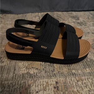 Comfortable Reef waterproof slides with textured black straps and tan footbed. Ideal for everyday use. Worn once.