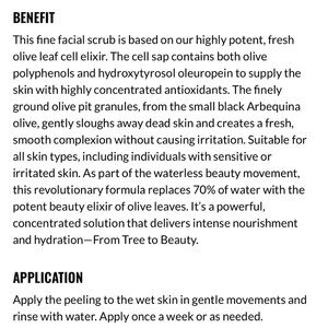 This fine facial scrub is based on our highly effective, fresh olive leaf cell elixir. The cell sap contains both olive polyphenols and hydroxytyrosol oleuropein to supply the skin with highly concentrated antioxidants. The finely ground olive stone granules, from the small black Arbequina olive, gently removes dead skin and creates a fresh, smooth skin look- without drying out or causing irritation.