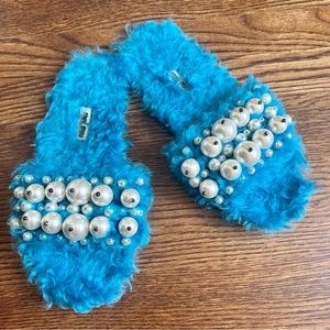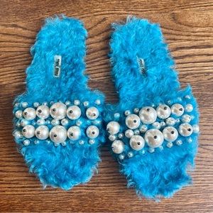 GORGEOUS Turquoise Miu Miu Blue Faux Fur Slides Sandals w/Pearls 9.5