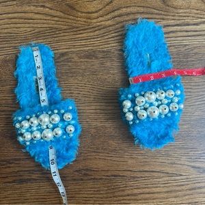 Vibrant blue furry sandals. Embellished with pearl accents. Stylish and unique design.
