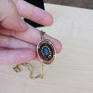 It's a goold tone necklace with the light of east Pendant. It's in good pre-owned condition.