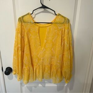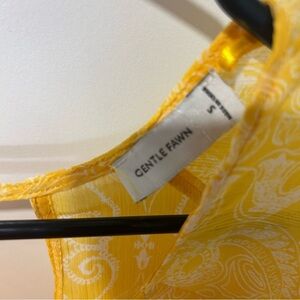 Keywords: Gentle Fawn, Yellow Blouse, Paisley Top, Long Sleeve Blouse, Peplum Top, Bohemian Style, Casual Blouse, Women's Fashion, Spring Blouse, Summer Blouse, Lightweight Top