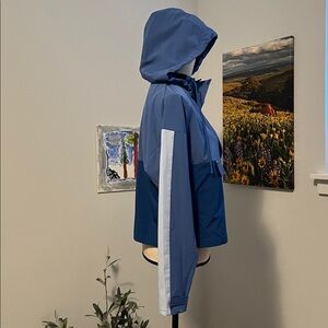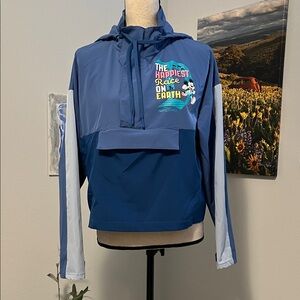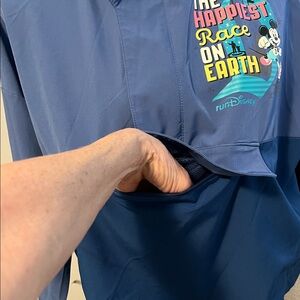 Run Disney windbreaker hooded jacket commemorating the 2024 half marathon. Jacket has a colorful Disney logo at L side in front. There’s a zip closure with velcro at top, that goes down to mid-jacket, and a deep zip pocket below holds all of your essentials. Dolman cut long sleeves also have velcro tabs for secure fit. The hood has drawstrings that can be pulled tighter to protect from the elements if needed. Only sign of wear is some piling at side of the mesh pocket as shown! Bust is 23” and length is 21”.