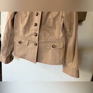 Chic utility jacket by Talbots. Features button details and front pockets. Ideal for versatile styling.