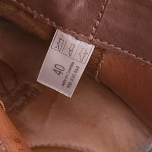Tan brown leather uppers with black patent leather detailing at sides and back.