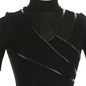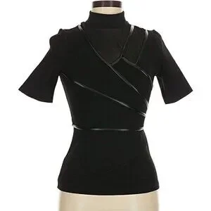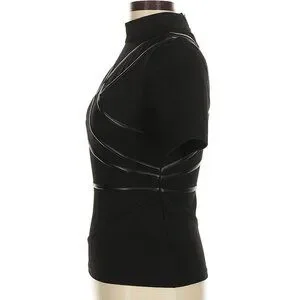 Great condition! Karen Millen short sleeve turtleneck bodycon shirt. Highly stretchy material. Semi-Sheer panel detail at neckline. Faux leather bondage straps across bodice. So different. Viscose, nylon, elastane blend. Quarter zip back. Size 6. PRICE IS FIRM.