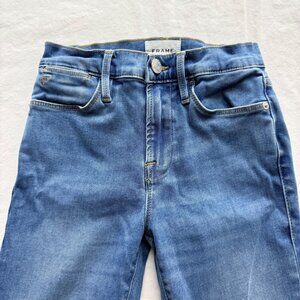 High-rise light wash jeans with a flared silhouette, distressed hem, and stretch fabric for comfort. Stylish design ideal for casual or semi-casual wear. Frame women's jeans size 24. Gently used. Standard wear. Smoke free home.