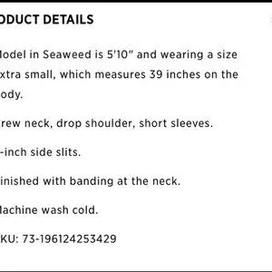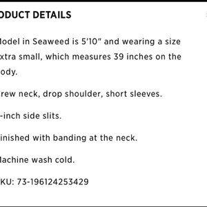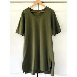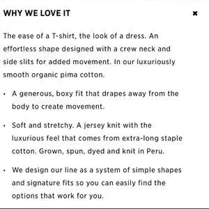 * STYLE- The ease of a t-shirt with the look of a dress. Effortless shape designed with a crew neck and 7" side slits for added movement. Luxuriously smooth organic pima cotton. Boxy fit drapes away from the body. Soft and stretchy- jersey knit with extra-long staple cotton. Drop shoulder. Short sleeve. Neck banding.