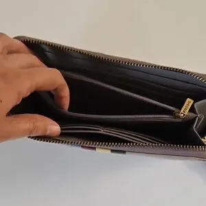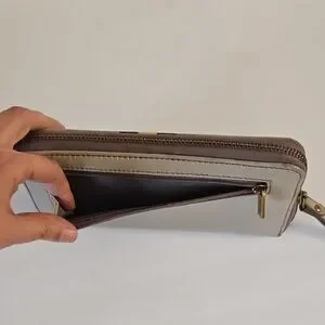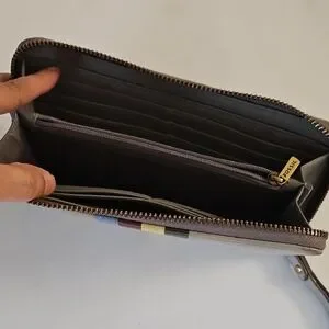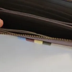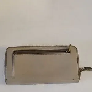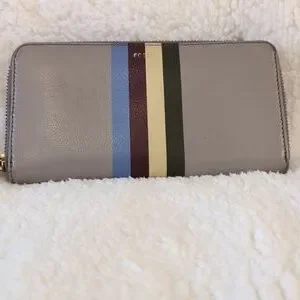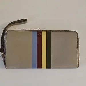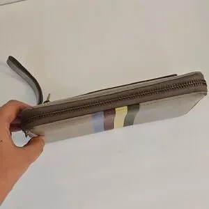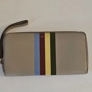 Chic Fossil wallet featuring vibrant stripes. Includes a handy wrist strap. In Great Condition.