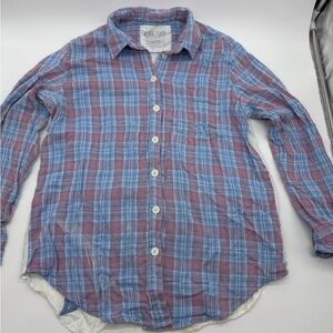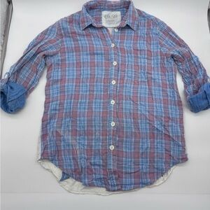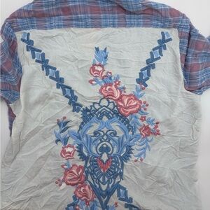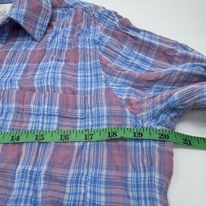 Kyla Seo for Anthropologie Blue/Pink Plaid, Embroidered, Roll Tab Sleeves, Med