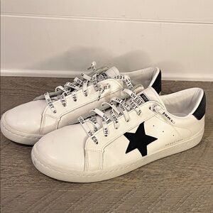 Vintage Havana white leather (synthetic) low top sneakers for woman: These white tennis shoes showcase a black (synthetic) suede star, black detailing on the heel, and a white outsole. Perfect for adding a bit of flair to any casual outfit!