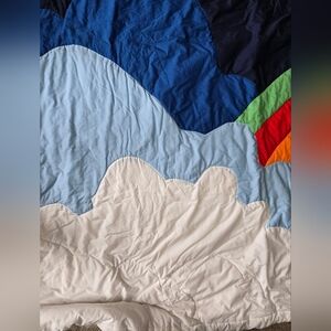 Vibrant and beautiful Hand stitched rainbow and cloud scene quilt.