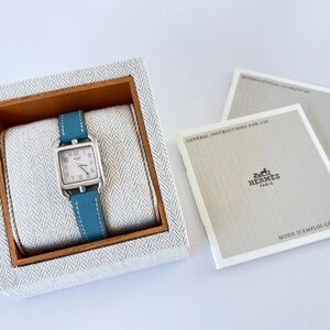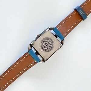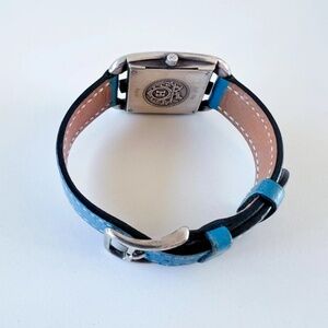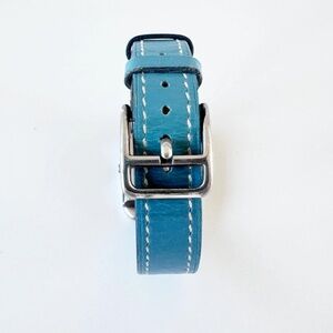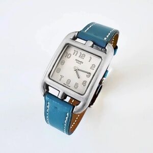 The Cape Cod was originally fashioned in sterling silver to have the look and feel of fine jewelry. After 1998, Hermès halted production of this version and offered the Cape Cod watch only in a stainless steel casing, making this 1996 sterling silver model much sought after. The watch is in working order and overall very good condition for a pre-owned timepiece. The sterling silver is bright, but given the nature of silver, there is slight tarnishing and some fine scratches and surface wear to the case. The blue leather strap and glass are in extremely good condition. (See photos for details.)