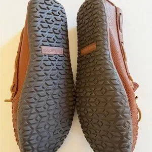 NWOT Stylish tan leather moosehide moccasins by Minnetonka. Size 10. Never worn.