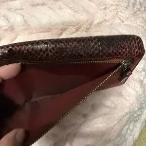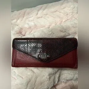 Stylish Coach wallet with a snakeskin texture. Features a dark brown hue. Ideal for chic organization.